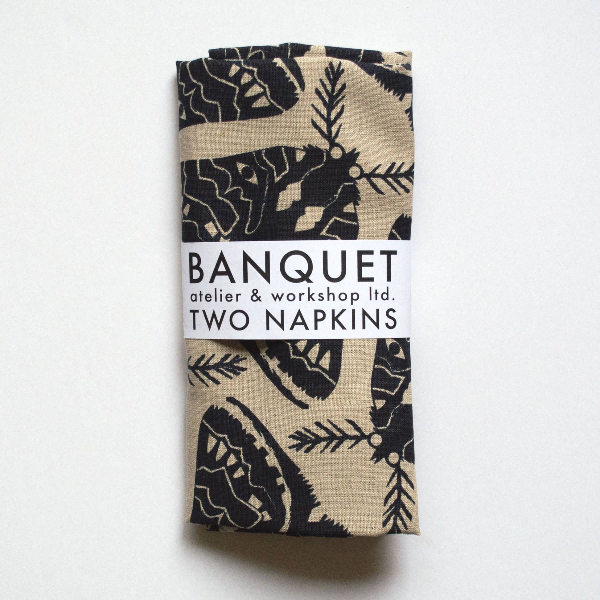 Gorgeous hand-sized moths screen printed in cool black water-based ink on a pair of un-bleached 100% all-natural linen 18 x 18 inch napkins. Washes up beautifully, cold water and hang to dry.