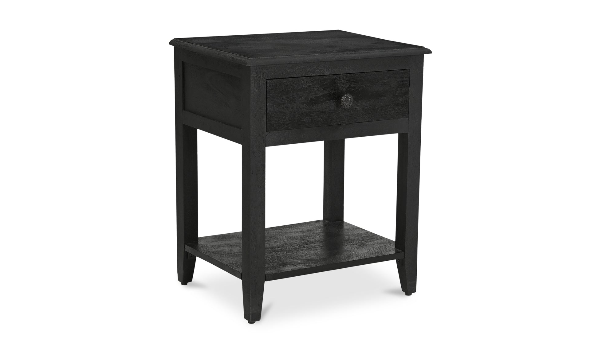 The Corrine nightstand adds a natural charm to any bedside arrangement by featuring a flower-detail drawer pull, subtly incorporating a rustic element into the minimalist design. Meticulously crafted from durable mango wood and completed with an antique-style finish, this nightstand offers lasting, practical storage with graceful, vintage appeal.