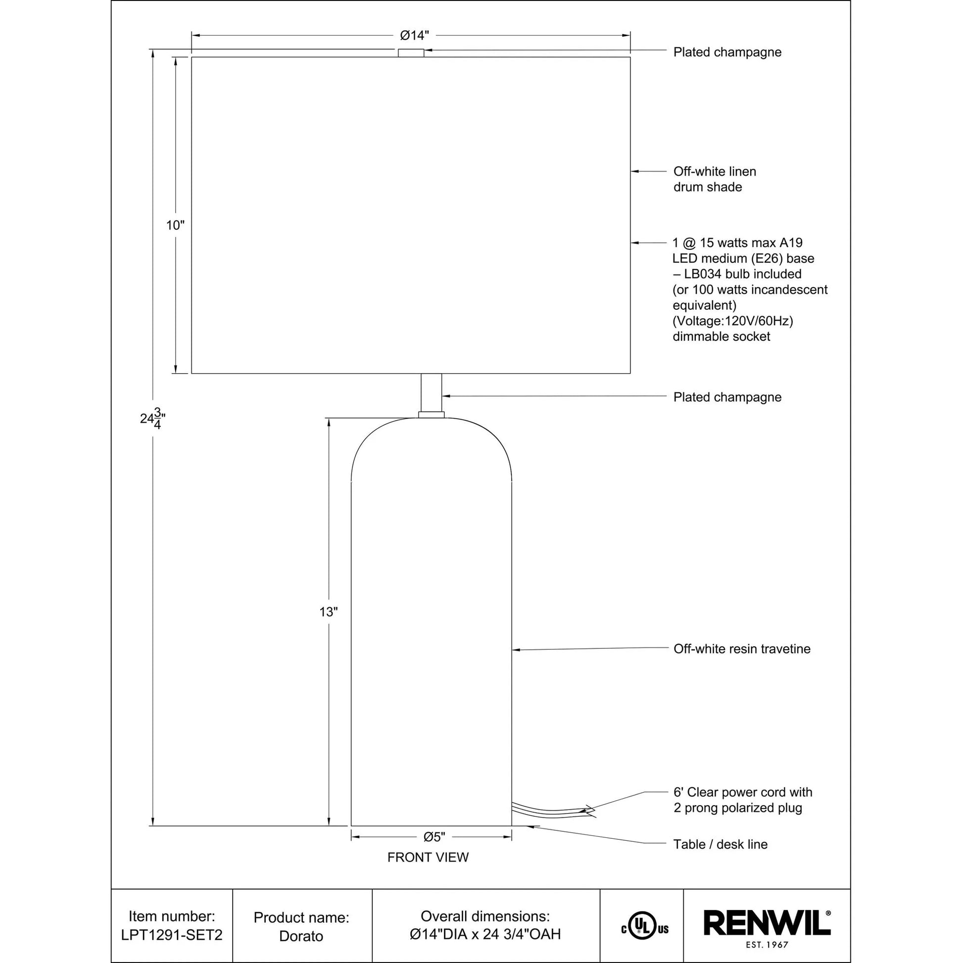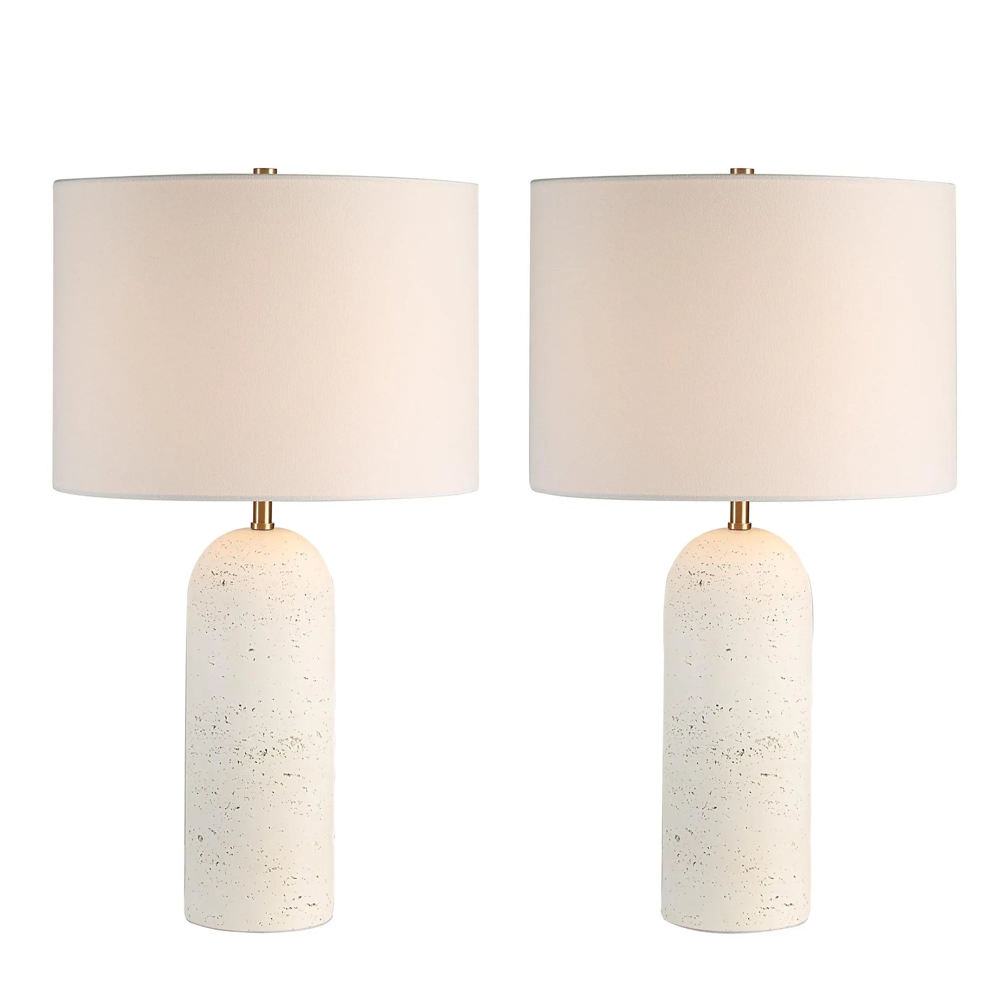Create an illumination sensation with this stately set of two table lamps. Designed with a dreamy, creamy colour palette, their travertine-look bases and off-white linen drum shades create a timeless effect that is at home in both contemporary and transitional settings.