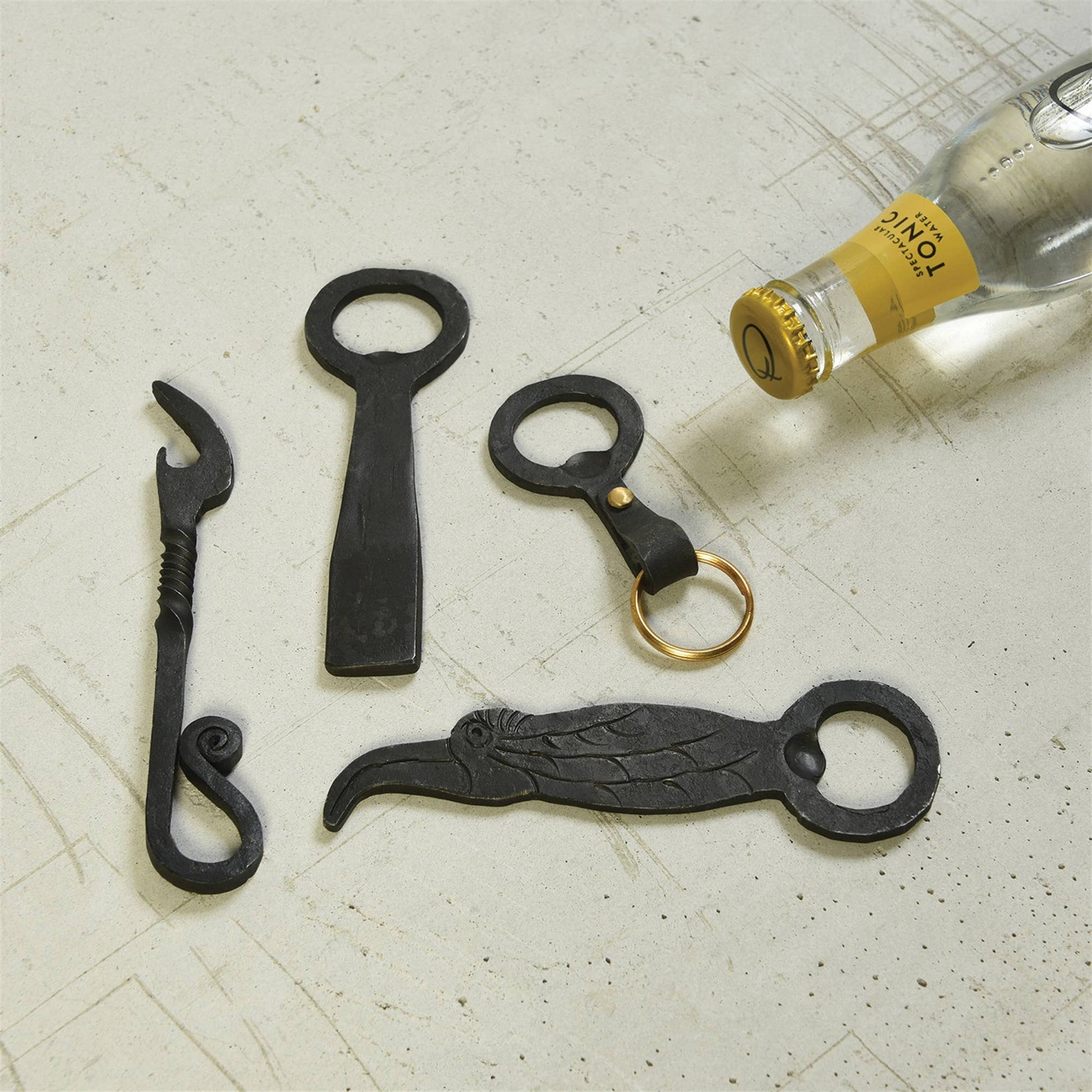 A classic article of daily use transformed into a fun way to pop the top of your favorite bottle. These sturdy openers are all forged of iron.