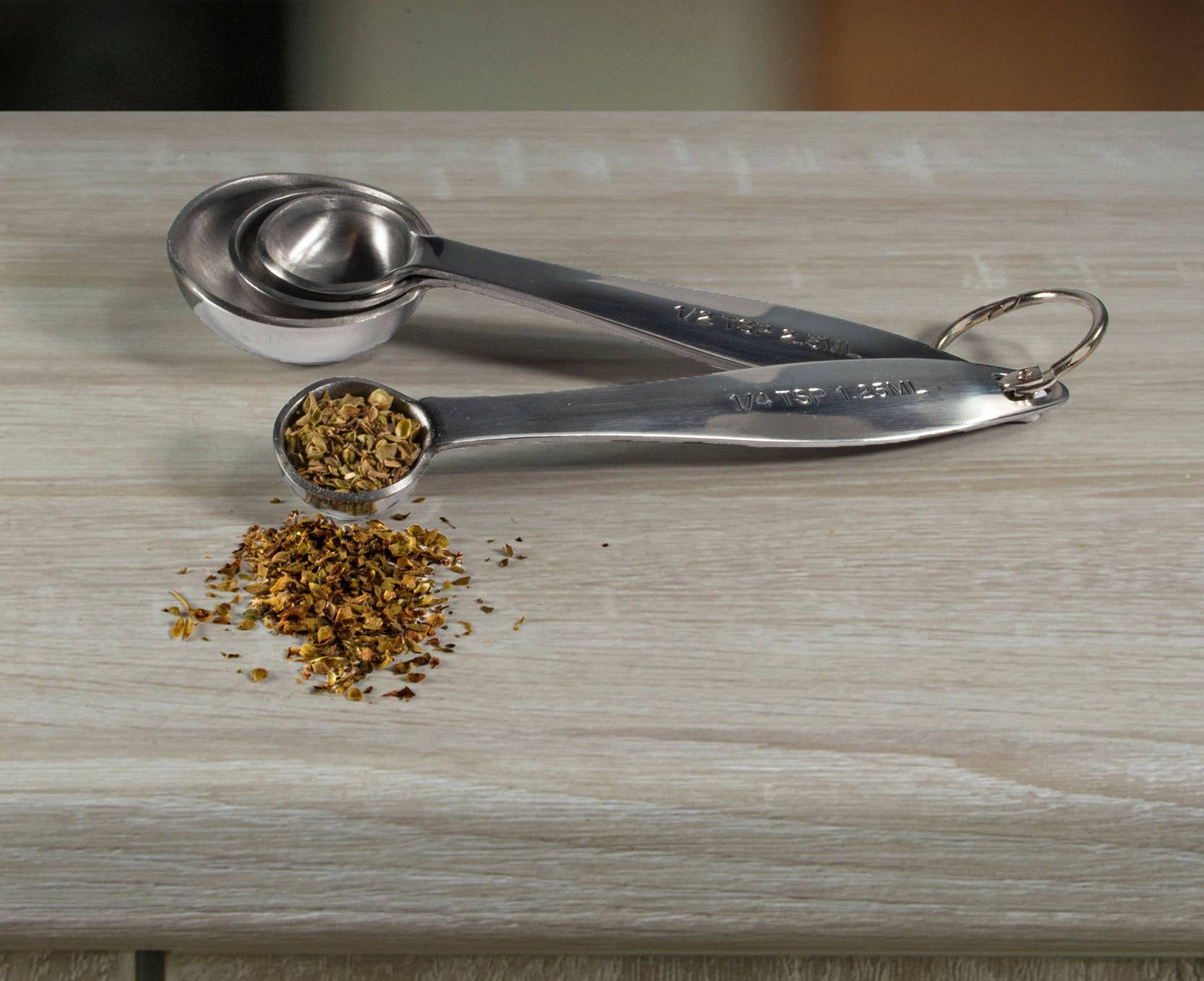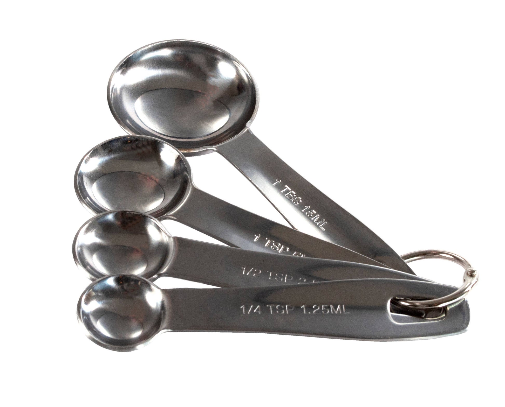Too beautiful to keep stashed away in a drawer, our stainless steel measuring spoon set in silver will lead the way. The gleaming set includes 1/4 TSP, 1/2 TSP, 1 TSP and 1 TBSP nesting measuring spoons, all linked by a removable ring. Beautify your baking process with upgraded essential tools that are a joy to use.