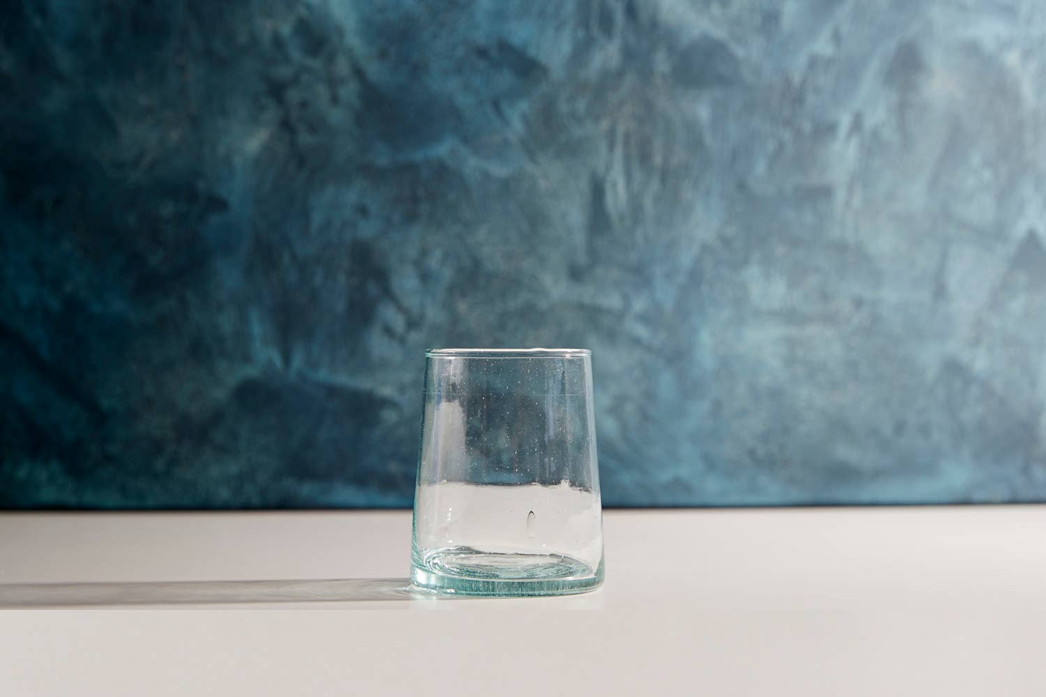 **Packaged in sets of 6** - Price is for individual glass. The sleek and simple design of these hand-blown cone shaped glasses are a testament to the style and skill of the artisans who make them. Used for all types of beverages or as little vases to decorate each table setting, you will enjoy the feel of them in your hand as you toast the joys of the day. Our Moroccan glassware sets come in four distinct shades of transparent glass (Clear, Amber, Blue & Green). The handblown construction is evident in the bubbles suspended in the glass itself, and the organic forms that the vessels take. Made from recycled beer and wine bottles, these sets are a second act for glass that would otherwise be sent to landfills. Small Cone: bottom diameter 3", top diameter 2.5" / 3.5" height. Capacity: 8 fl oz Packaged in sets of 6 in traditional Moroccan gift packaging.