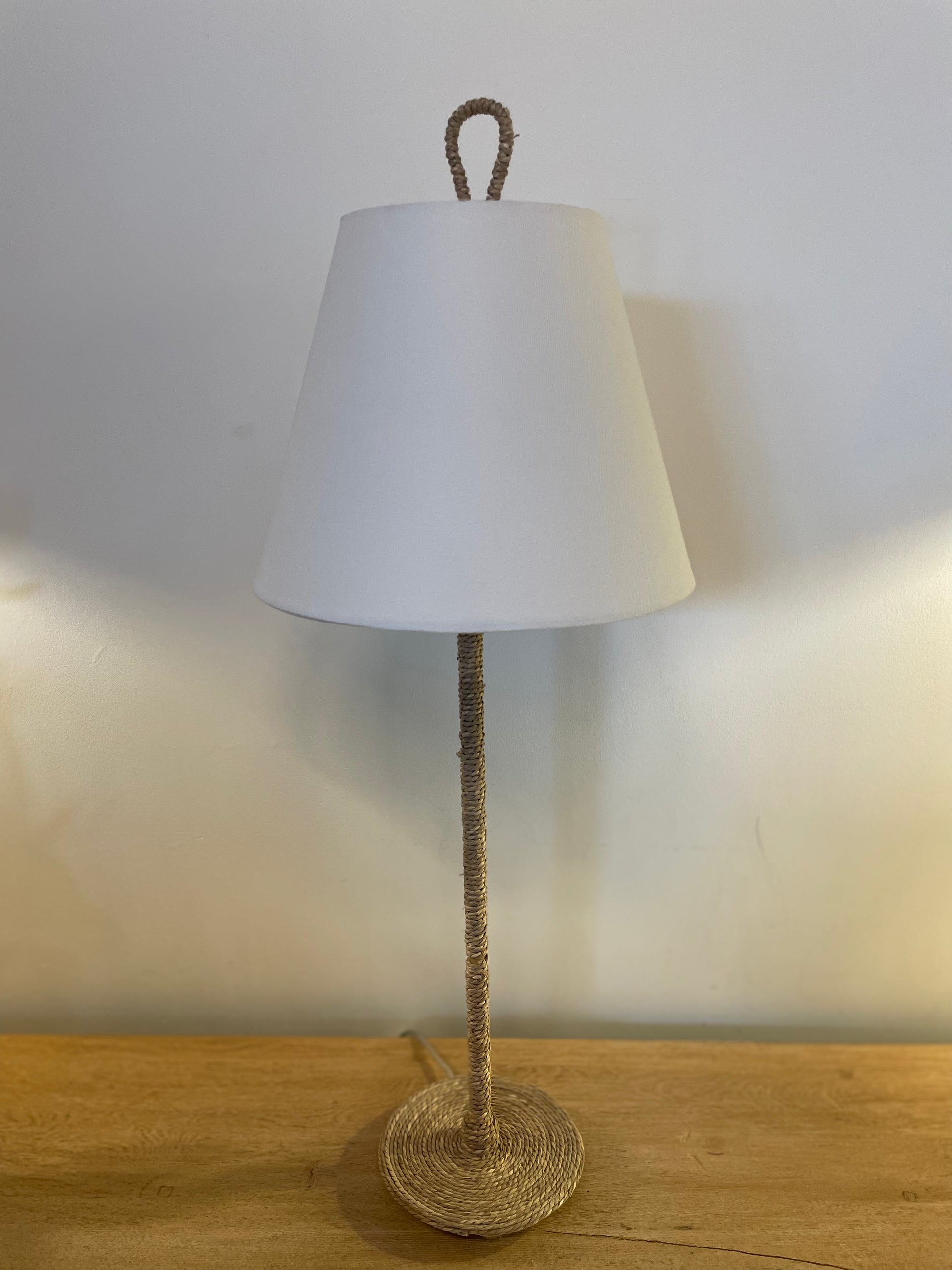 Bring a touch of effortless coastal elegance into your home with this beautifully crafted woven rope table lamp. Featuring a slender, hand-wrapped rope base and a matching loop accent at the top, this lamp blends natural texture with a timeless silhouette. The crisp white fabric shade softens the light, creating a warm and inviting ambiance perfect for living rooms, bedrooms, or reading nooks.