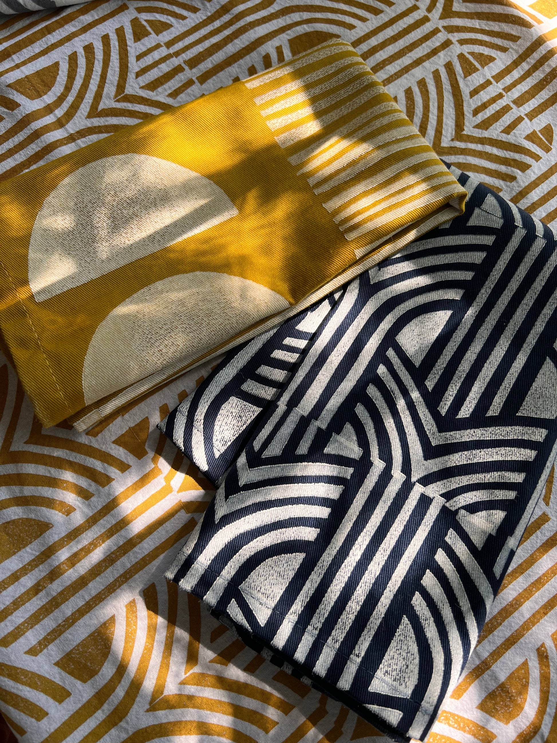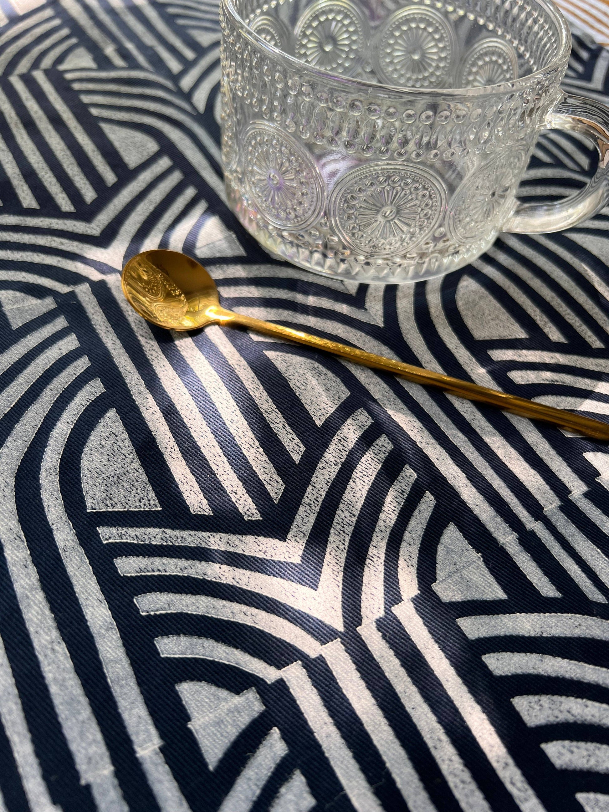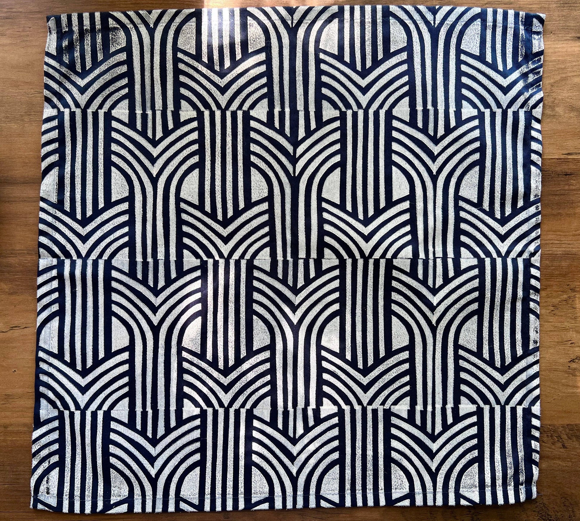 Set of two cotton blend napkins, approximately 18 by 18 inches. “Intertwined” is an interlocking, geometric pattern.