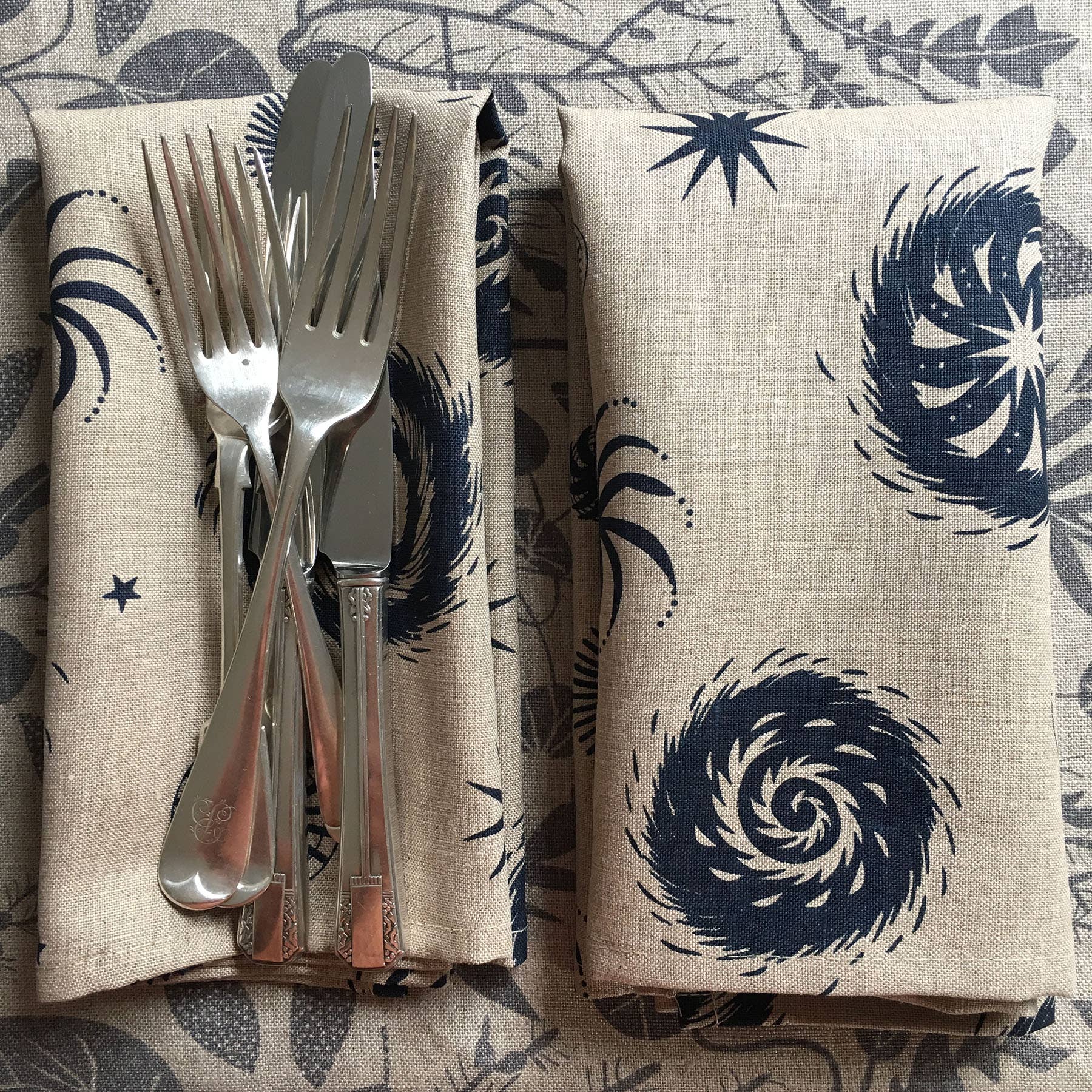Navy explosions printed on an all natural unbleached 100% linen 20 x 28 inch tea towel. Washes up beautifully, cold water and hang to dry because its better for our universe.