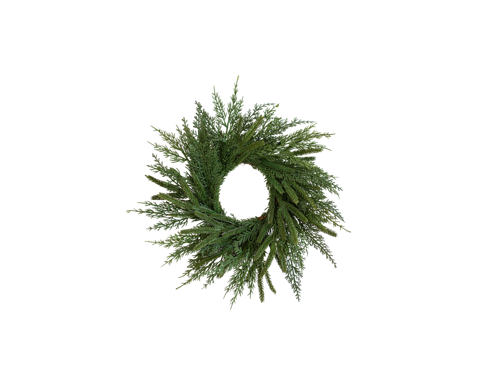 Expertly crafted with a mix of faux Norfolk Cypress, this wreath brings a touch of nature and elegance to your home. Enjoy the beauty of fresh decorations without the maintenance. Versatile and long-lasting, this wreath is perfect for any season or occasion. This mini version is the perfect addition to your bar stools or cabinets during the holiday season. Dimensions: 12" ( also available in 24" in our shop).