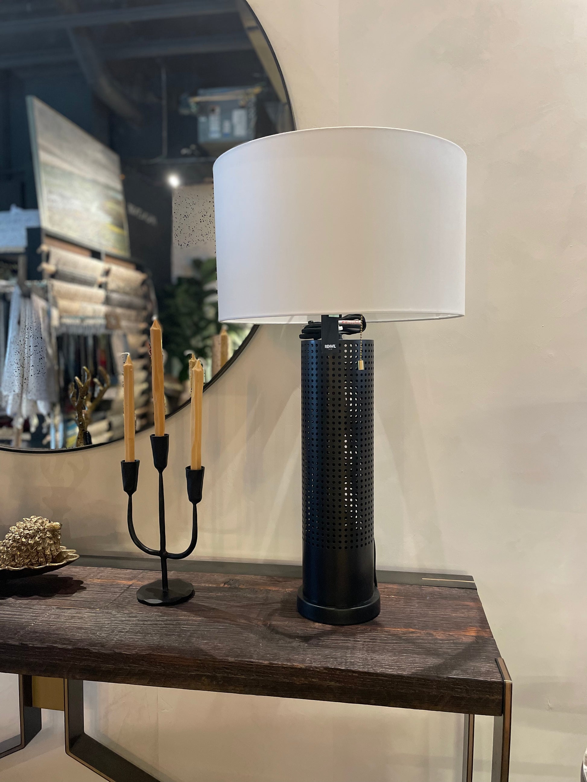 Perforated details along a iron base serve to enhance the glowing light this table lamp provides. The contrast of its black powder coating and off-white cotton shade brings a dramatic appeal to its resting place. It needs no additional accessory to catch the eye.