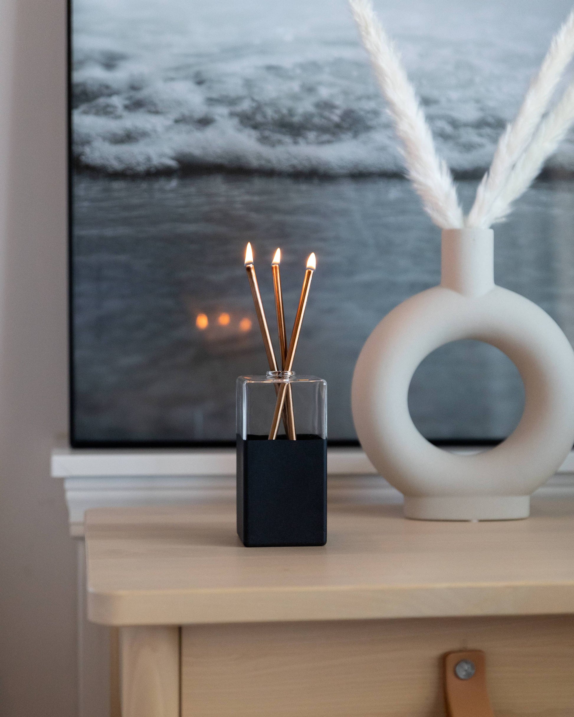 Airy hand-blown glass, dipped with a matte-black finish that feels like textured stone to bring in depth and boldness. With a touch of laidback-luxury inspired by the coastal lifestyle, this rectangular Jervis collection seamlessly blends elegance with understated living. Product Highlights • Exclusive Everlasting Candle Co. design • Hand-blown borosilicate glass • Textured stone finish • 4.92”H X 2.36”L