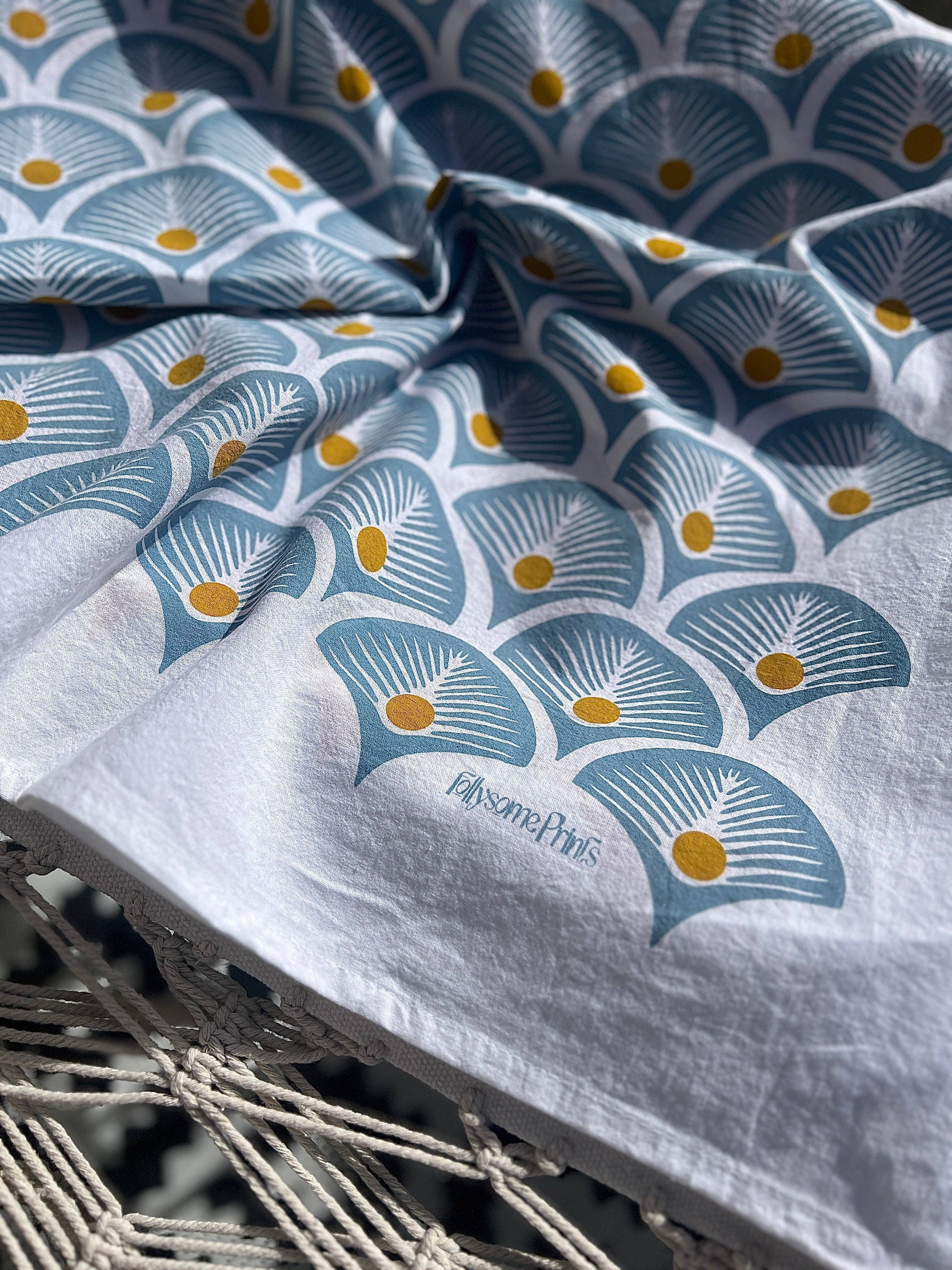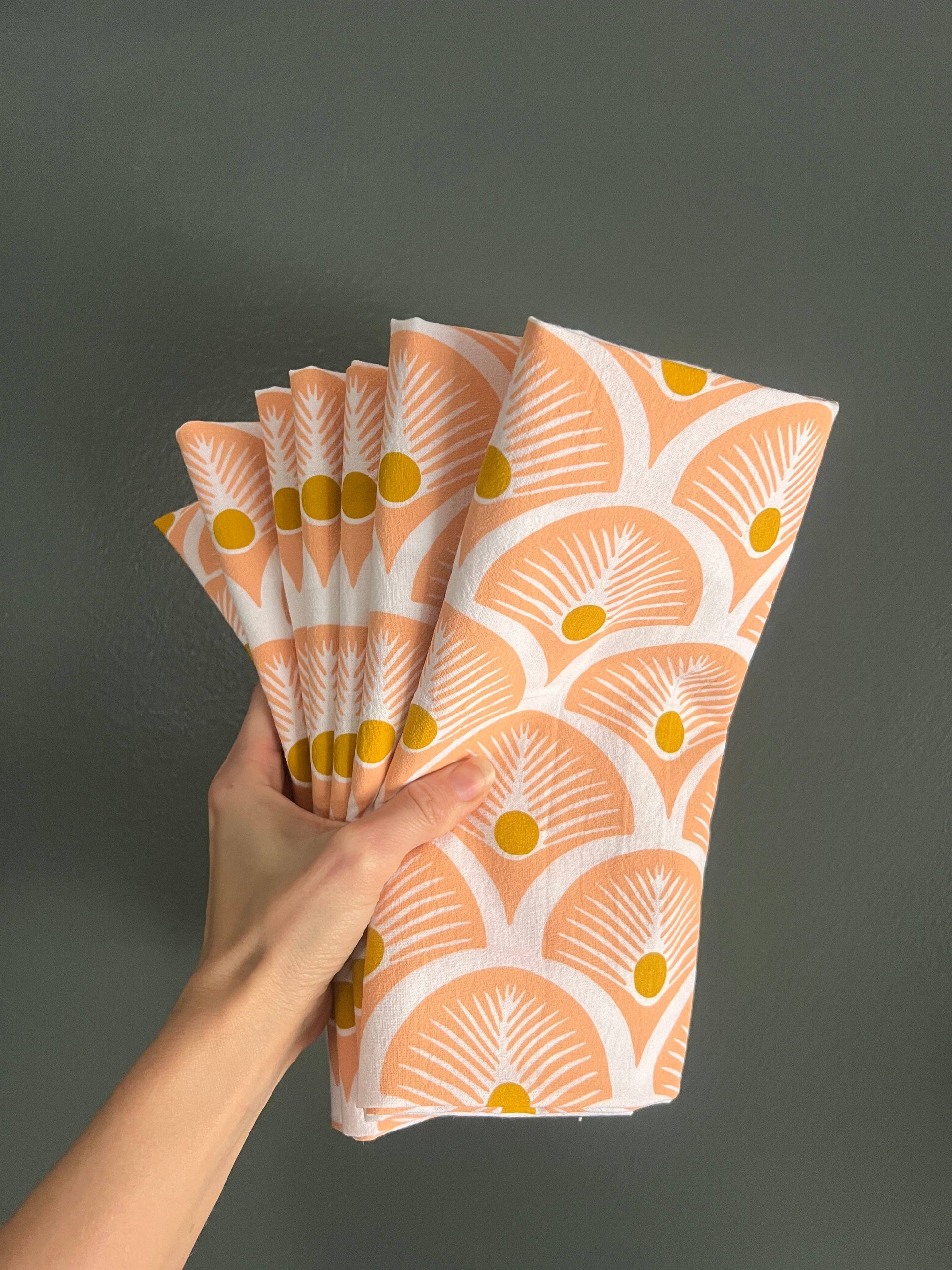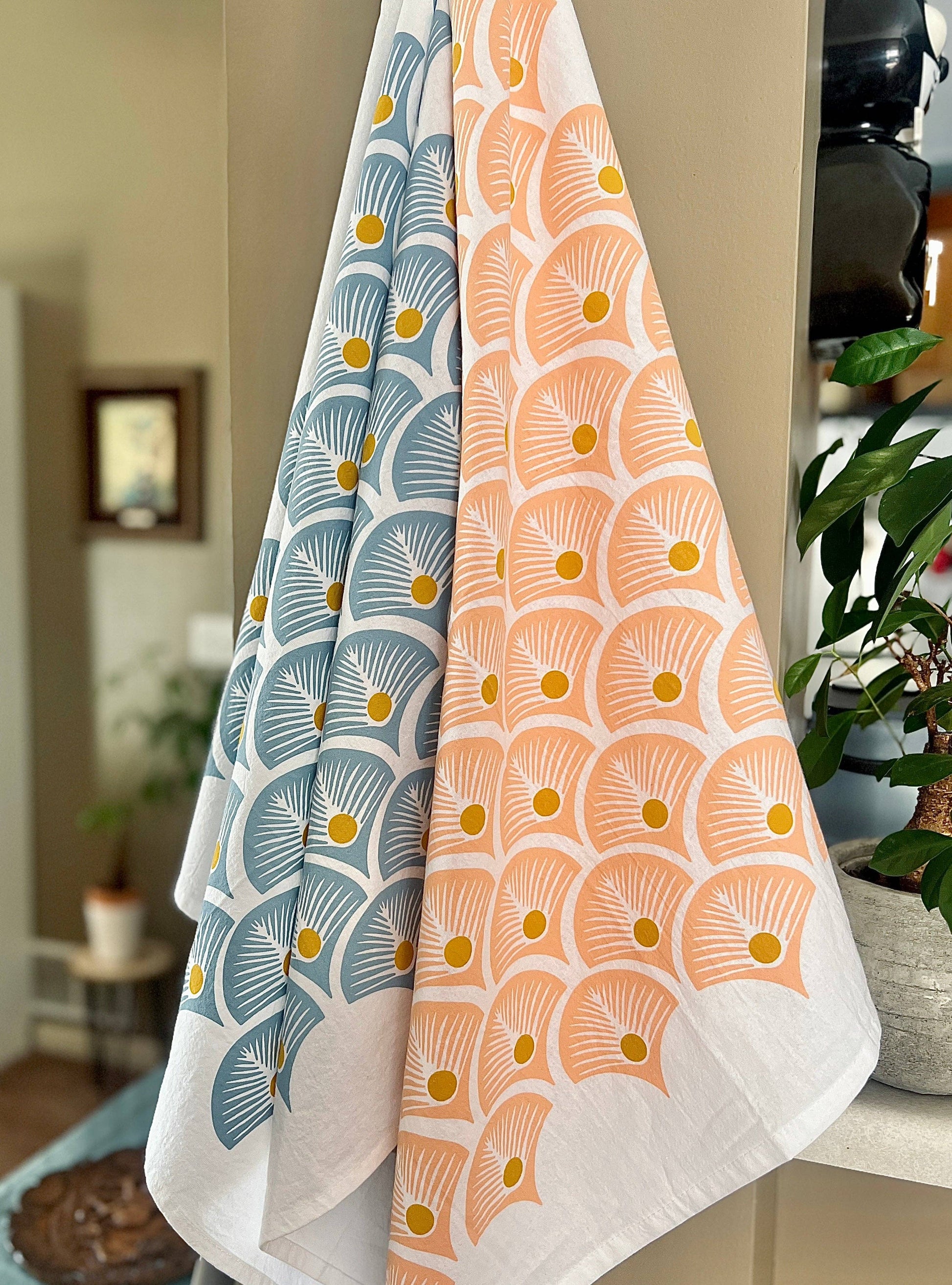 Oversized cotton tea towels are hand printed in the Midwest with an original pattern design.