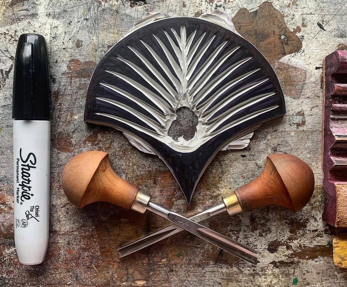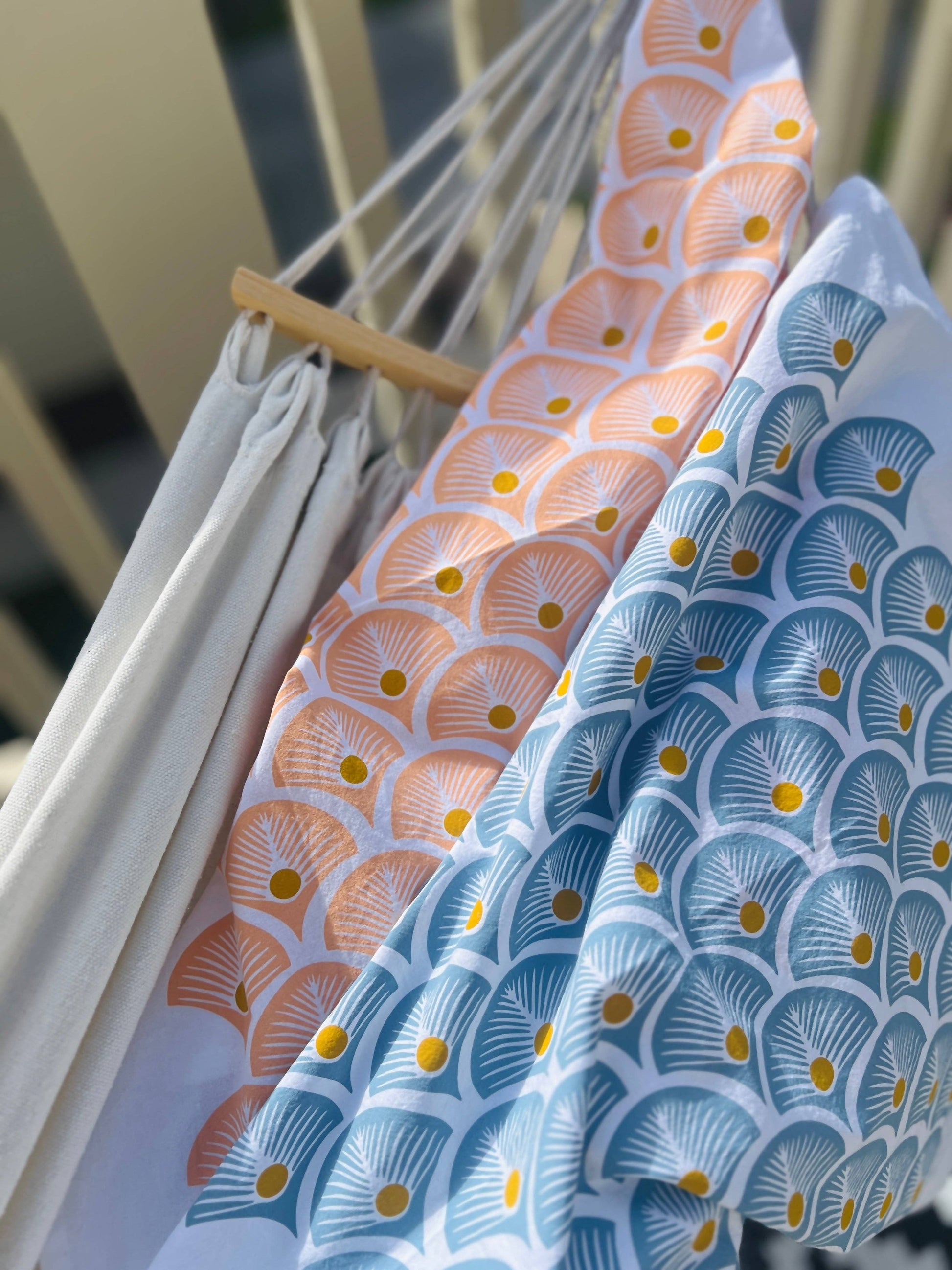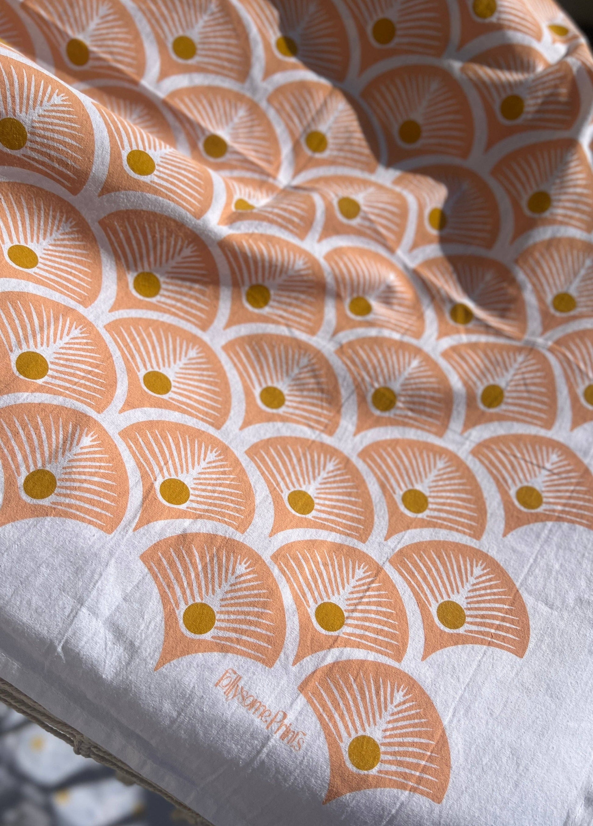 Oversized cotton tea towels are hand printed in the Midwest with an original pattern design.