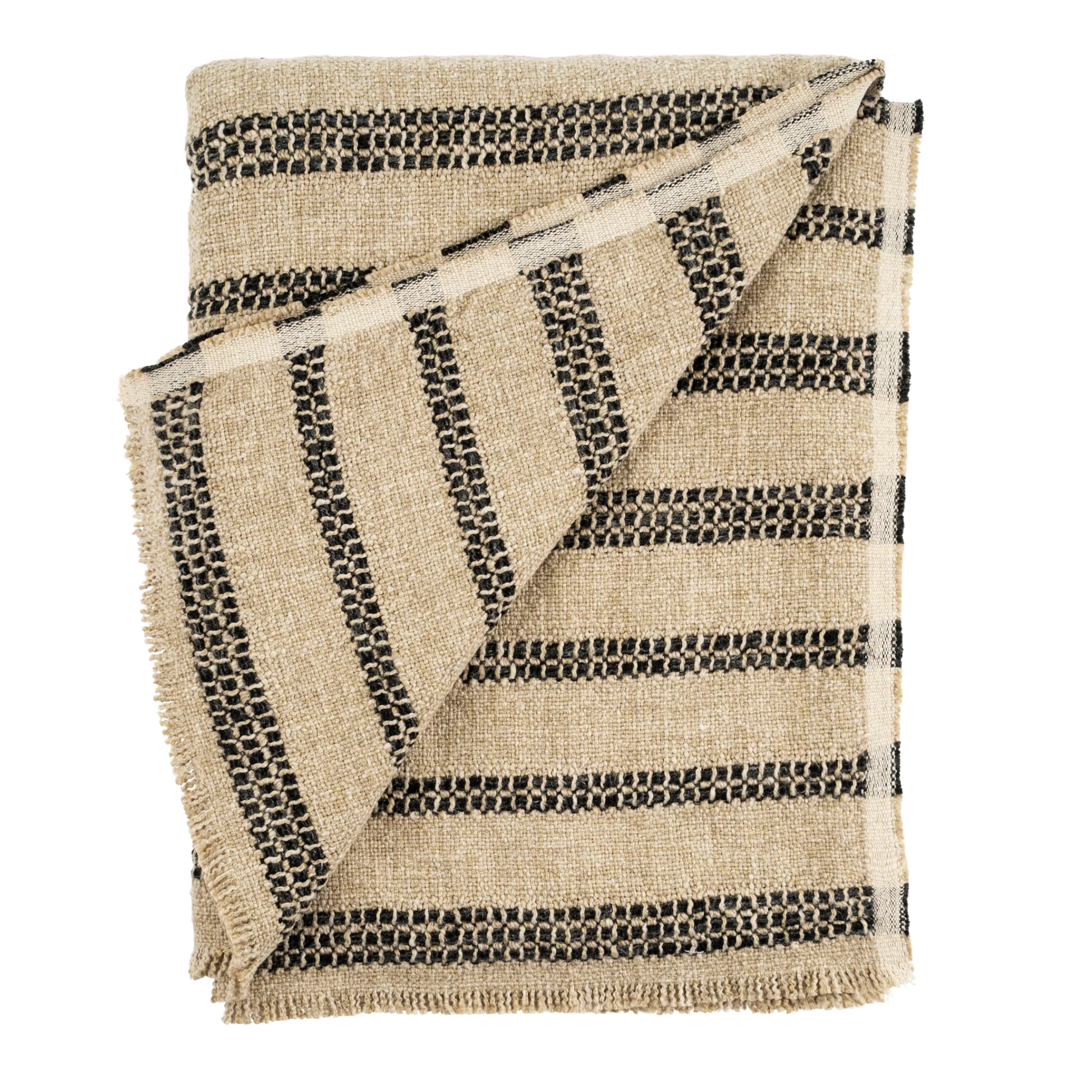 The handwoven Tahoe Striped Throw is adorned with meticulously crafted duos and trios of woven black stripes and is delicately finished with an exquisite eyelash fringe at each end. Its versatility knows no bounds, allowing you to effortlessly style it on your sofa, drape it gracefully on the end of your bed, or even take it outdoors for a captivating addition to your alfresco setting. Handwash and lay flat to dry, or dry clean. Do not iron