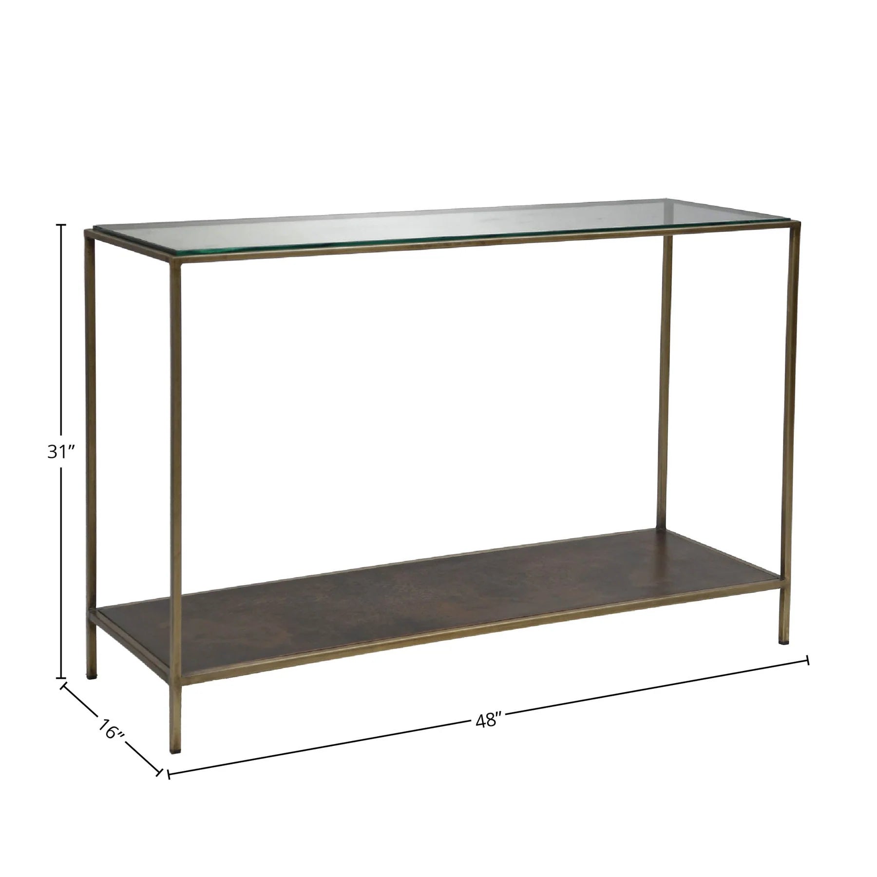 Crafted to be bold and stand out! This piece was designed with glass table top and antique brass accents, to add an industrial-glam vibe to your space.