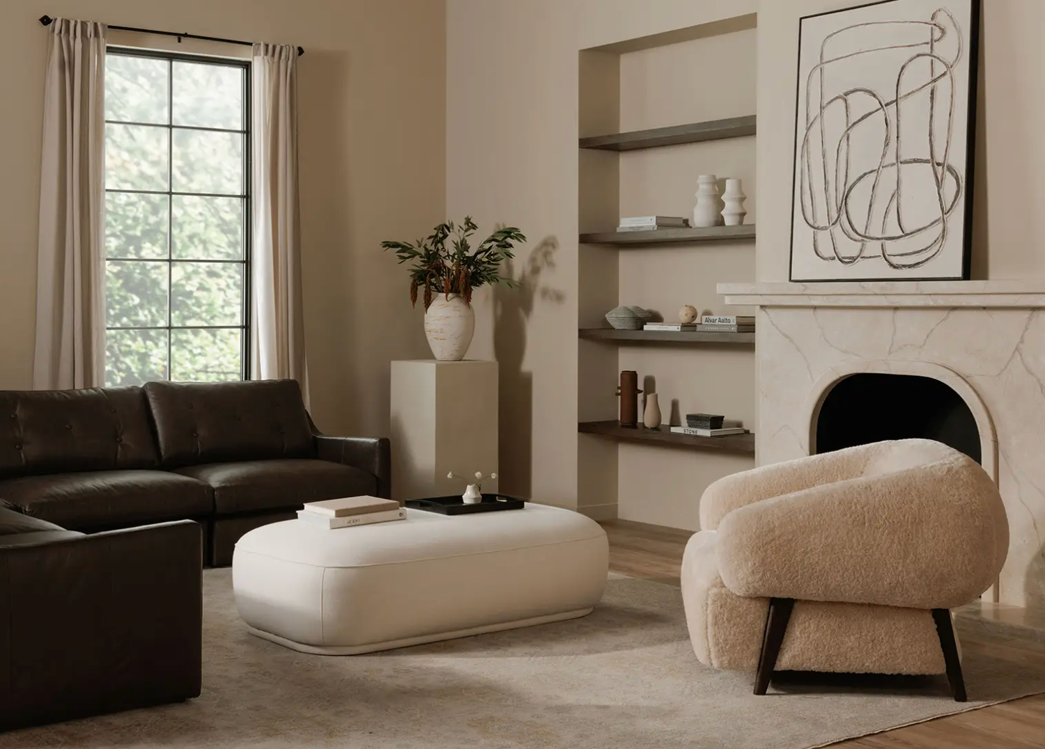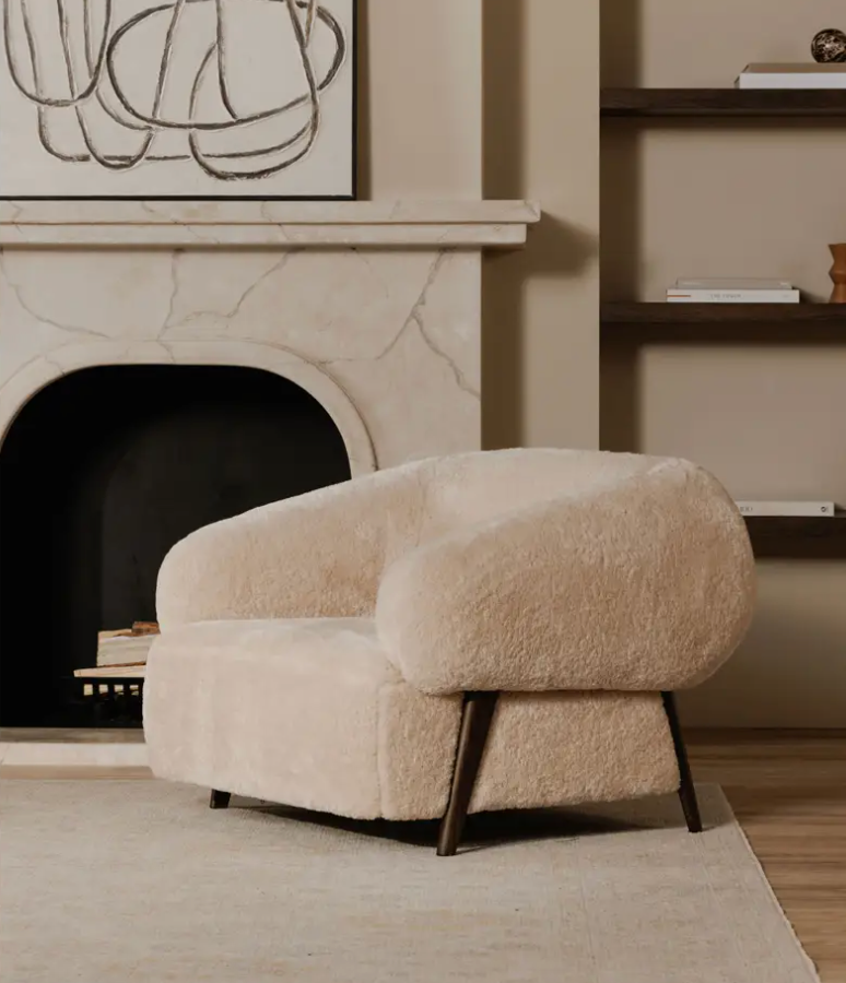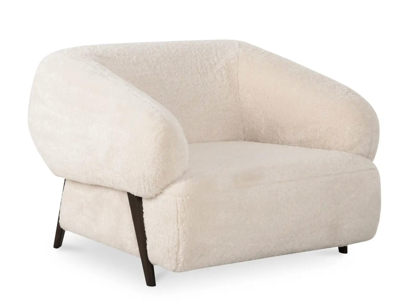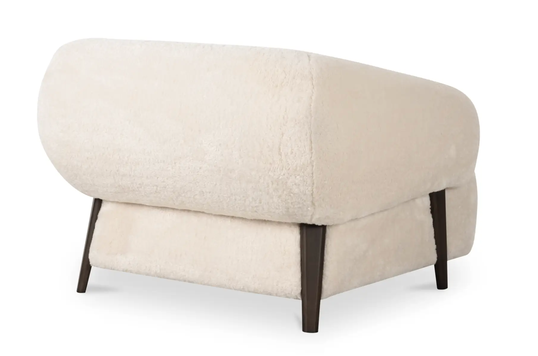 The Viking lounge chair redefines comfort with its oversized seat and plush design, set atop solid ash legs for a modern, grounded look. Its unique silhouette is deep and inviting, blending a squared base with curved forms and off-white faux fur upholstery.